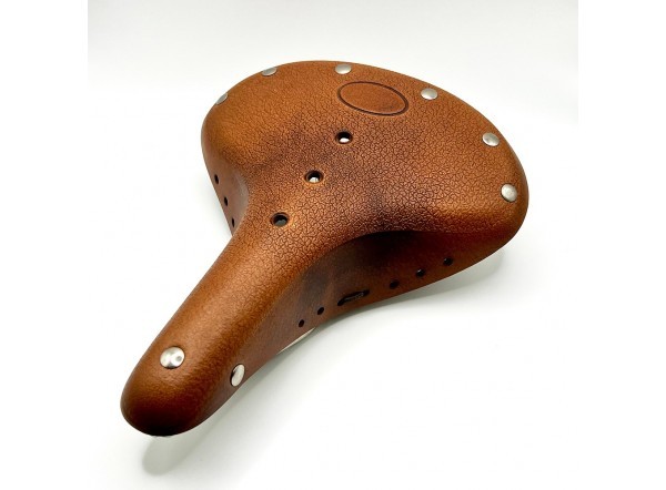 Sillín de piel genuina Gyes SL-09 en color miel con efecto envejecido. Diseño artesanal con remaches metálicos y superficie texturizada. Perfecto para bicicletas clásicas, urbanas o de paseo.Recipiente :